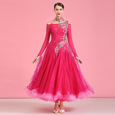 Abito da ballo da sala da donna elegante fucsia con applicazioni floreali in strass, spalle scoperte, abito da competizione per valzer, tango, rumba moderna