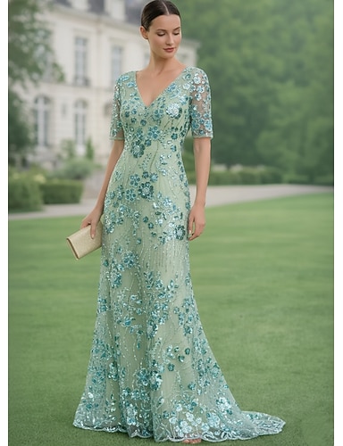 Sirena Tromba Lunghezza alla caviglia Abiti da Cocktail Elegante Scintillante Floreale Manica Corta Scollo a V Festa serale Festa in giardino Raso Tulle con Fiore ricamato Perline Ricamo