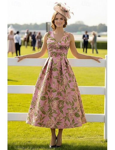 Linea ad A Lunghezza alla caviglia Lunghezza Tè Abito Derby Abiti da Cocktail Elegante Vintage Senza Maniche Scollo a V Formale Derby del Kentucky Tasca Jacquard con Pieghe