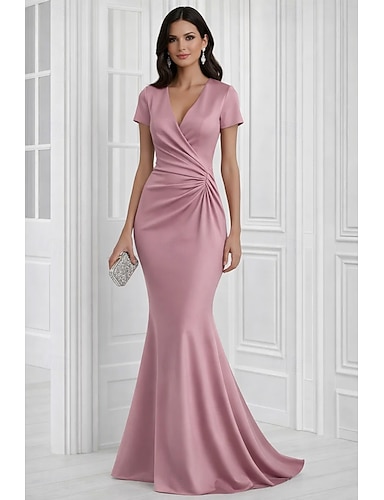 Sirena Tromba Strascico a Terra Abito da Sera Abito formale Elegante Manica Corta Scollo a V Matrimonio Formale Vestito Rosa Raso con Arricciato