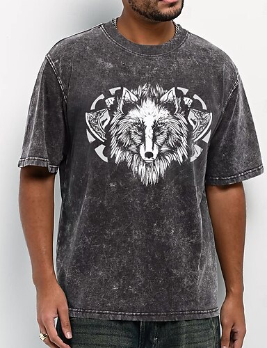 T-shirt vintage streetwear da uomo con testa di lupo dettagliata, emblema, lavaggio acido, manica corta, girocollo, casual, abbigliamento da tutti i giorni, abbigliamento firmato, abbigliamento s m l