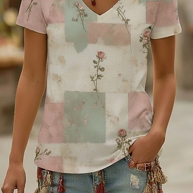 Per donna Camicia Boho Maglietta Stampato Floreale Grafico Bohemien Vintage Classico Manica Corta Scollo a V Top Regolari Quotidiano Rosa Estate Primavera