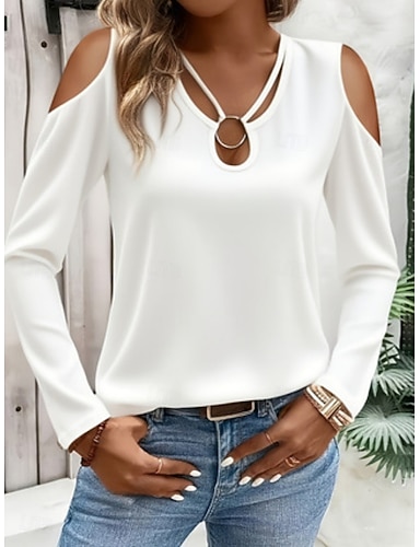 Per donna Maglietta Foro Semplice Moda Elegante Classico Manica Lunga Scollo a V Top Regolari Quotidiano Uscire Weekend Nero Bianco Estate Primavera Autunno