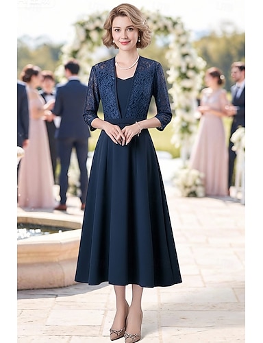 Abito A-Line lunghezza tè abito da festa abito da cocktail abito da invitato matrimonio abito madre della sposa manica corta collo tondo elegante formale con perline