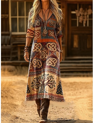 Abito Maxi da Donna Boho Vestito Sheath Party Casual Quotidiano Appuntamento Andare in giro Vestibilità Regolare Grafica Geometrica Paisley Manica Lunga V Collo Marrone Scuro Primavera Autunno Inverno