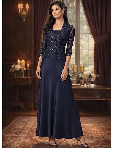 Linea ad A Tre Pezzi Lunghezza al pavimento Abito da invitata a nozze Abito da cerimonia per signora Manica 3/4 Collo quadrato Elegante Semplice Lussuoso Formale Ospite di nozze Raso Pizzo con Pizzo