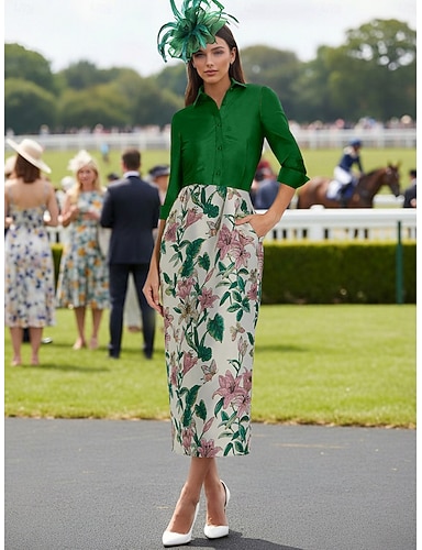 Tubino Colonna Lunghezza alla caviglia Abiti da Cocktail Abiti da festa Elegante Madre della sposa Manica Lunga Colletto a Camicia Matrimonio Formale Nylon con Stampa floreale