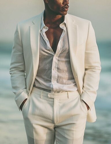 Uomo Smoking Completi in Lino Matrimonio in Spiaggia Casuale Caffè Primavera, Autunno, Inverno, Estate Tuta Bavero classico Moda Festa Tinta unita Vestibilità standard 2 pezzi Monopetto a un bottone