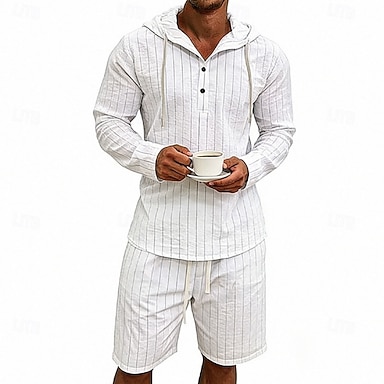 Per uomo Camicia di lino Due pezzi Camicia popover E Shorts Shorts di Lino Shorts da Spiaggia Impostare Strisce verticali Quotidiano All'aperto Vacanza Con Cappuccio Manica Lunga Estate Primavera