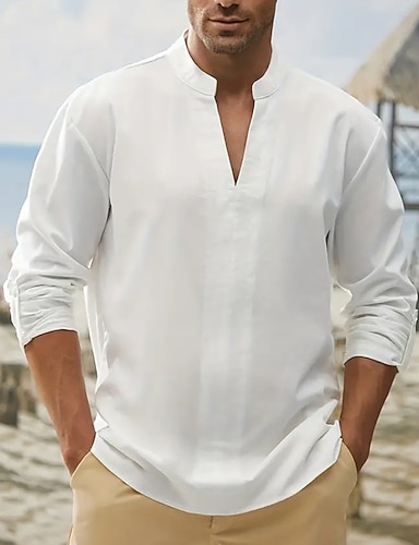 Per uomo Camicia camicia di lino Camicia in lino e cotone Camicia in cotone bianco Camicia con colletto cinese Camicia con colletto alla coreana Liscio Da mare Informale Bianco Manica lunga A V