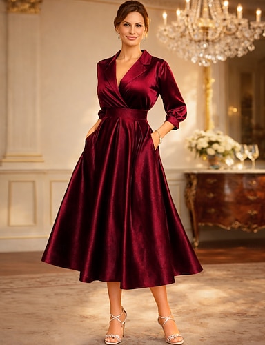 Linea ad A Lunghezza alla caviglia Vestito da Festa Abito da Cocktail Abito da invitata a nozze Abito da cerimonia per signora Manica 3/4 Colletto a Camicia Elegante Formale Ospite di nozze Raso con