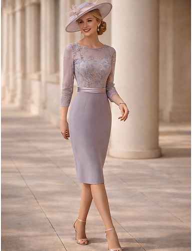 Due Pezzi Tubino Colonna Lunghezza Tè Abito da invitata a nozze Abito da cerimonia per signora Manica 3/4 Collo gioiello Elegante Formale Ospite di nozze Tessuto Elasticizzato con Pizzo Applicazioni