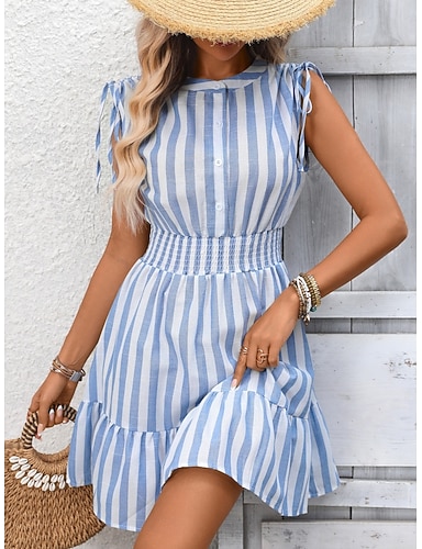 Per donna Mini Abito Vestito Casual Abito in finto lino Elegante Moda Moderno All'aperto Vacanza Uscire Vestibilità regolare A righe Senza Maniche Girocollo Rosa Rosso Grigio scuro Azzurro Estate