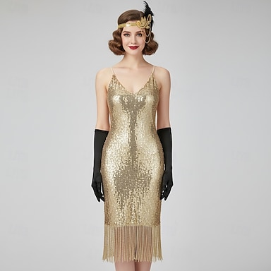 Anni Ruggenti Anni 1920 Midi Abito Flapper Abito da cocktail Set di accessori Senza maniche Il grande Gatsby Invitato al matrimonio Paillettes Frangia con nappe Scollo a V Costume Per donna Mascherata