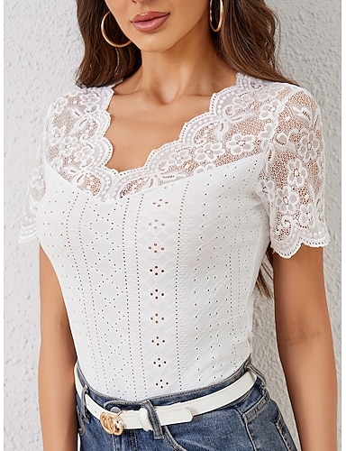 Top Elegante in Pizzo Bianco da Donna con Occhielli Blusa Casual Monocromatica Classica Maniche Corte V Collo Pizzo Occhiello Fit Regolare Quotidiano Bianco Giallo Romantica Petite Estate Vacanze