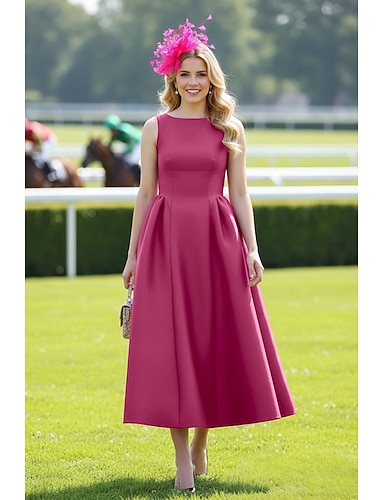 Linea ad A Lunghezza Tè Vestito da Festa Abito da Cocktail Abito da invitata a nozze Abito da cerimonia per signora Senza Maniche Scollo a Barca Elegante Semplice Formale Ospite di nozze Ferie Raso