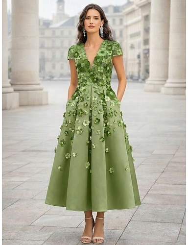 Linea ad A Lunghezza Tè Vestito da Festa Abito da Cocktail Abito da invitata a nozze Abito da cerimonia per signora Manica Corta Scollo a V Elegante Taglie Forti Alto Basso Ospite di nozze