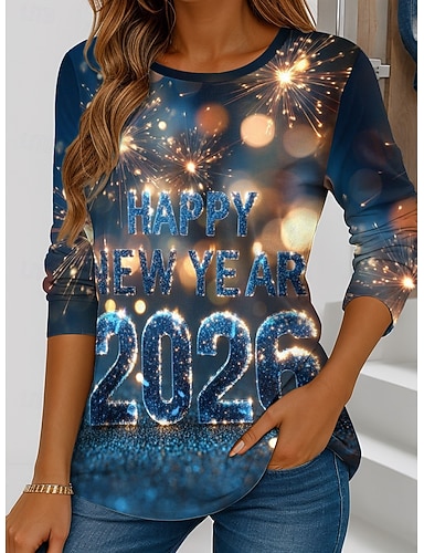 Capodanno Per donna Maglietta Stampato Grafico Moda Moderno Manica Lunga Girocollo Top Regolari Quotidiano Weekend Blu Nero Vino Rosso Blu Reale Autunno Inverno