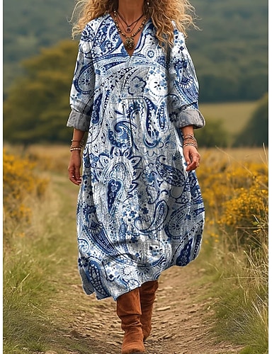 Abito Midi da Donna Boho Vestito Shift Casual Quotidiano Vestibilità Larga Grafica Paisley Manica Lunga V Collo Blu Cielo Arancio Blu Scuro Autunno Inverno