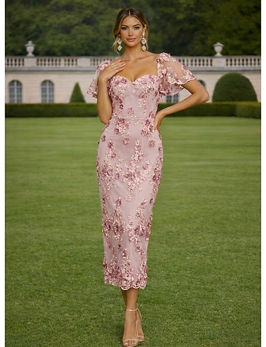 Tubino Colonna Lunghezza alla caviglia Abito in Pizzo Abiti da Cocktail Elegante Vintage Floreale Manica Corta Scollo a Cuore Festa in giardino Matrimonio Raso Tulle con Fiori 3D Ricamo Applicazioni