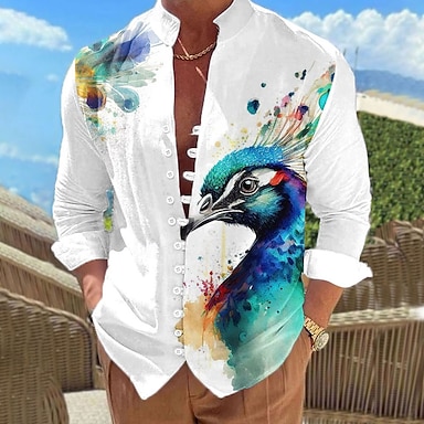 Per uomo Fenicottero Uccello Pavone Camicia Camicia di lino Camicia hawaiana estiva Manica Lunga Casual Vacanza Ferie Abbigliamento mare Estate Primavera Colletto Mao Stampa 3D Bottonato Rosa Blu