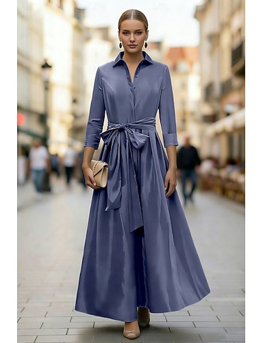 Linea ad A Lunghezza al pavimento Abito da invitata a nozze Abito Formale Abito da sera Abiti da Ballo Elegante Manica 3/4 Colletto a Camicia Balli di fine anno Formale Raso Elasticizzato con