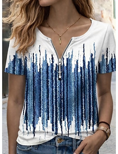 Per donna Maglietta Cerniera Zip a un quarto Grafico Geometrico Blocco di colori Tropicale Hawaiano Elegante Manica Corta Girocollo Scollo a V Top Regolari Quotidiano Sportivo Uscire Bianco / blu