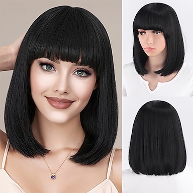 Parrucca corta nera da donna con frangia, lunghezza 12 pollici, capelli sintetici lisci fino alle spalle, per cosplay da festa quotidiana