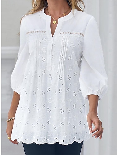 Per donna Camicia popover Camicia casual Blusa Traforato Tinta unica Elegante Quotidiano Casual Manica 3/4 Scollo a V Top Regolari Quotidiano Spiaggia Ferie Bianco Estate Primavera Autunno