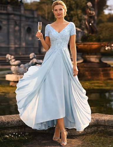 Linea ad A Lunghezza Tè Vestito da Festa Abito da Cocktail Abito da invitata a nozze Abito da cerimonia per signora Manica Corta Scollo a V Elegante Taglie Forti Alto Basso Ospite di nozze
