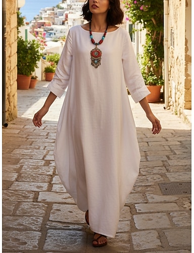 Per donna Abito Lungo Maxi Abito Abito maxi Finto cotone e lino Abito Camicia Vestito a caftano Abito Bianco Classico Casual Quotidiano Vacanza Vestibilità comoda Semplice Manica 3/4 Colletto a