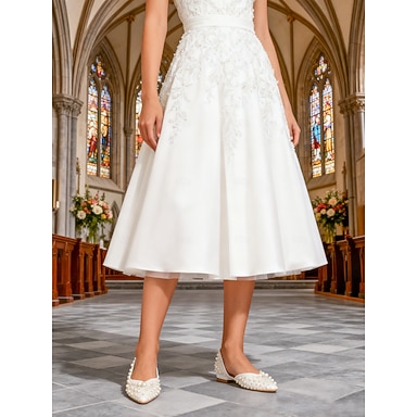 Scarpe da sposa eleganti con punta affilata in pizzo color avorio e cinturino alla caviglia con perle, per matrimoni in giardino