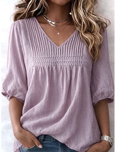 Per donna Camicia Blusa Finto cotone e lino Semplice Casual Manica Lunga Scollo a V Top Regolari Quotidiano Ferie Uscire Giallo Rosa Cachi Grigio Estate Primavera