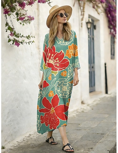 Abito lungo da donna in lino simile leggero e traspirante abito estivo a spostamento abito a forma di A abbigliamento da vacanza casual boho da spiaggia quotidiano floreale manica 3/4 collo rotondo