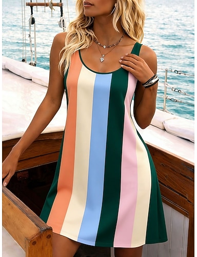 Per donna Mini Abito Abito a trapezio Abito Estivo Abito a spalle scoperte Vacanza Casual Quotidiano Spiaggia Ferie Vestibilità regolare Grafico Geometrico A righe Senza Maniche Collo a U Rosso Viola