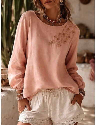 Per donna Blusa Camicia in finto lino Ricamato Floreale Elegante Casual Manica Lunga Girocollo Top Regolari Quotidiano Blu Bianco Rosa Verde militare Rosso Estate Primavera Autunno