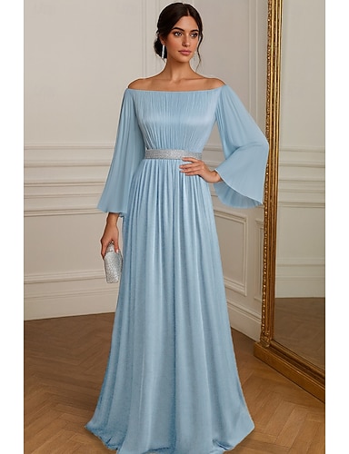 Linea ad A Lunghezza al pavimento Abito da Sera Abito formale Elegante Setoso Manica Lunga Senza Spalle Matrimonio Formale Raso con Applicazioni Tasca