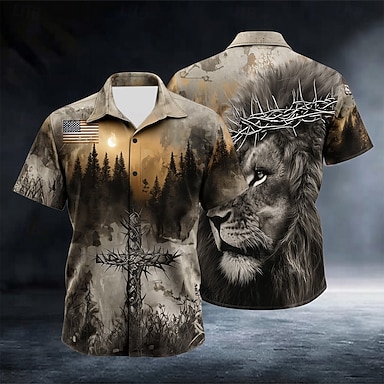 Per uomo Animale Leone Croce Templare Camicia Camicia Estiva Camicia con Bottoni Manica Corta Vintage Retrò All'aperto Vacanza Abbigliamento Quotidiano Estate Primavera Collo ripiegato Stampa 3D