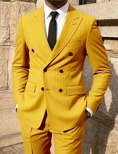 Per uomo Blazer Completi Affari Cocktail party Ricevimento di matrimonio Moda Casual Primavera Autunno Poliestere A righe Tasca 2 Pezzi Confortevole Doppiopetto Giacca Nero Giallo Blu
