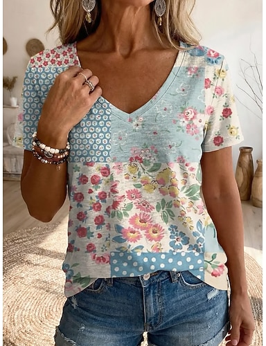 Per donna Maglietta Stampato Grafico Piante Vintage Casual Manica Corta Scollo a V Top Regolari Quotidiano Weekend Abbigliamento da vacanza Blu Viola Verde Estate Primavera
