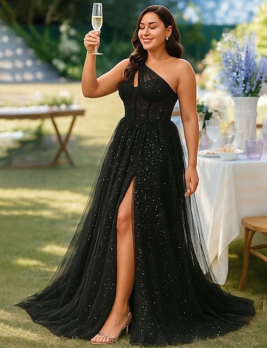 Abito lungo nero A-Line da festa senza maniche eleganti taglie forti scollo a V abito formale con tulle e perline con spacco frontale