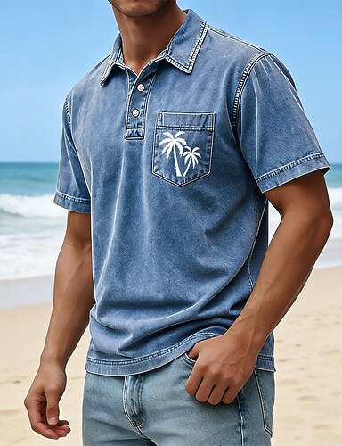 Per uomo Palma Camicia lavata con acido 100% cotone Manica Corta Magliette polo Bavero Hawaiano Casual Athleisure Abbigliamento da vacanza Tasca Stampa 3D Bottoni Primavera & Estate Blu Rosso Verde