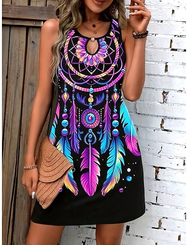 Per donna Mini Abito Vestito Estivo Vacanza Boho Spiaggia Uscire Vestibilità regolare Grafico Tribale Senza Maniche Girocollo Nero Viola Estate Primavera