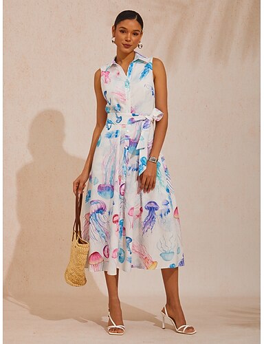 Linea ad A Lunghezza Tè Abiti da Cocktail Abiti da festa Elegante Stile Celebrità Principessa Senza Maniche Colletto a Camicia Festa in giardino Matrimonio Raso con Stampa floreale Arricciato Ricamo