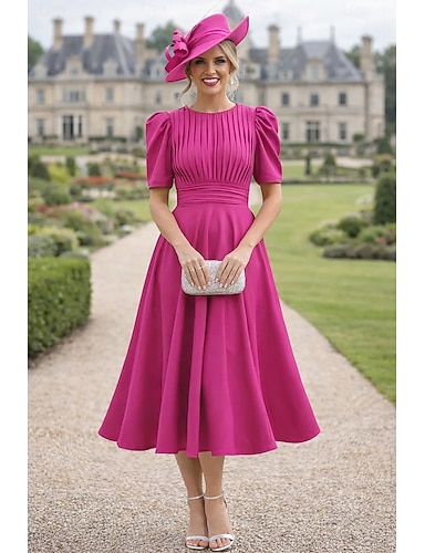 Linea ad A Lunghezza Tè Abiti da Cocktail Elegante Abiti semi formali Manica Corta Girocollo Festa in giardino Matrimonio Tasca Raso Shiena scoperta con Con perline Pieghe