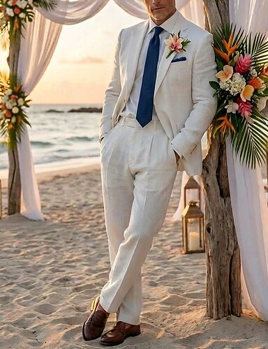 Uomo Completi in Lino Matrimonio in Spiaggia Affari Bianco Grigio chiaro Primavera & Estate Tuta Bavero a lancia Leggero Formale Tinta unita Vestibilità su misura 2 pezzi Monopetto Due Bottoni