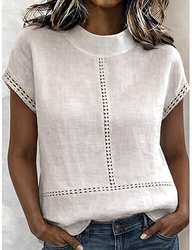 Per donna Blusa Camicia di cotone Finto cotone e lino Traforato Tinta unica Quotidiano Elegante Essenziale Manica Corta Collo alla coreana Top Regolari Quotidiano Bianco Estate Primavera