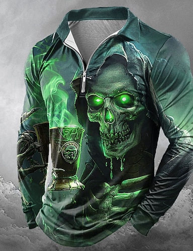 Giorno dei Morti Per uomo Teschio Teschi Polo con zip Manica Lunga Magliette polo Bavero Casual Orrore Scuro All'aperto Abito da festa Stampa 3D Primavera Autunno Inverno Rosso Blu Viola