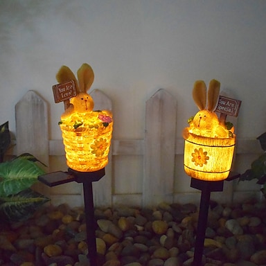 Luce solare da esterno impermeabile per coniglietto pasquale in resina, barile di legno, giardino, cortile, sentiero, decorazione per prato, decorazione per le feste, luce d'accento per il paesaggio