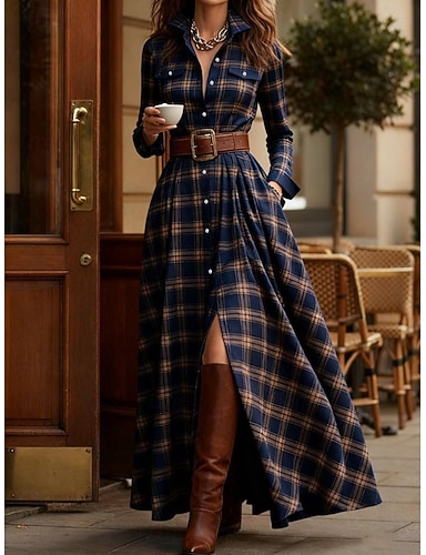 Per donna Abito maxi Abito a Tubino Vacanza Casual Boho Quotidiano Vestibilità regolare Plaid Manica Lunga Colletto a Camicia Blu Rosso Verde Primavera Autunno Inverno
